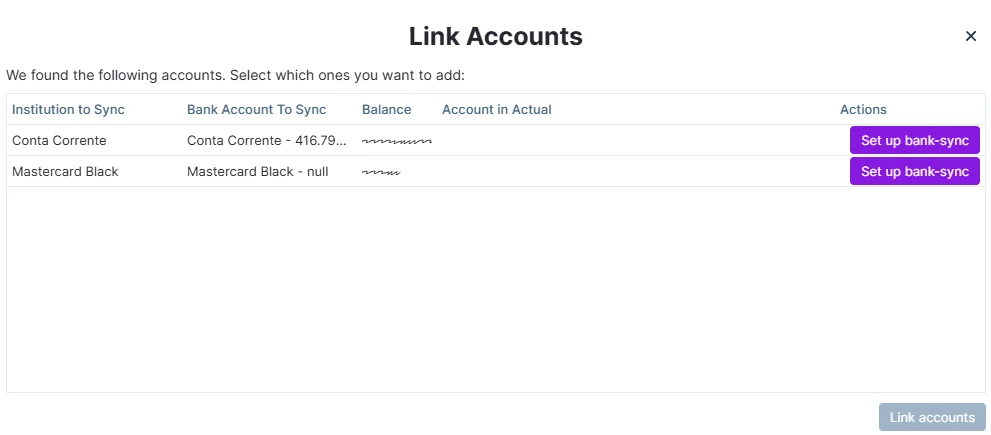 A list of accounts from your Pluggy connection will appear.