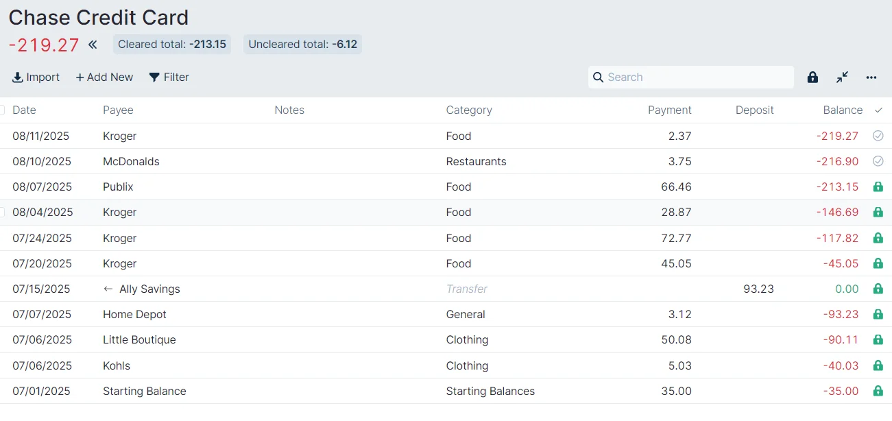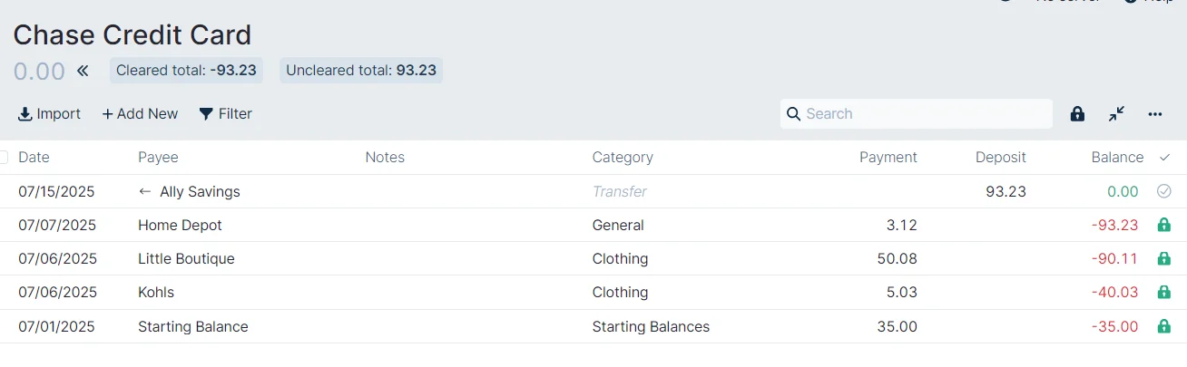 We started our budget at the beginning of July and we normally pay off our Chase Credit Card statement every month. We had some new transactions from June, so we entered a Starting Balance of $35.00.
