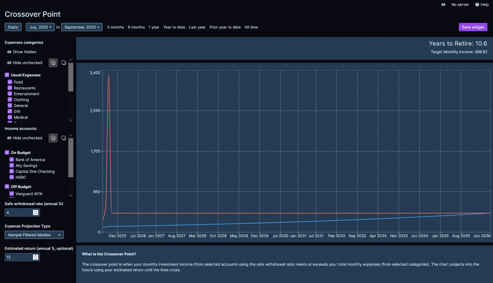 Hampel Filtered Median: Uses a Hampel test to filter out outlier monthly expenses. Then calculates the median amount from the remaining months and projects it into the future.